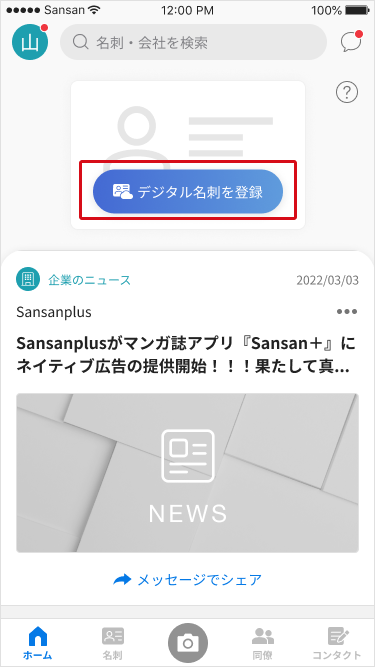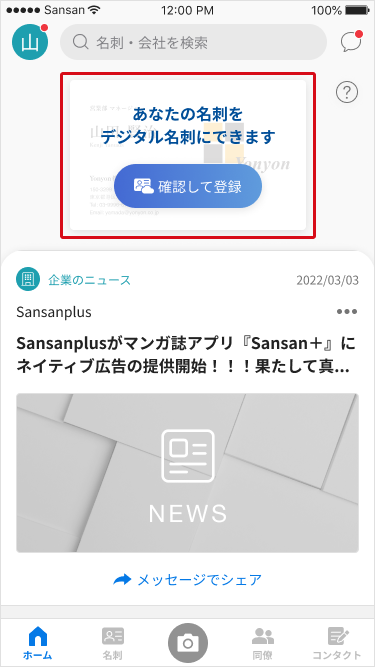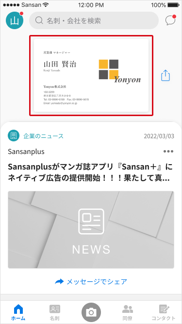 ホームタブの名刺をタップするとデジタル名刺の確認ができます。
