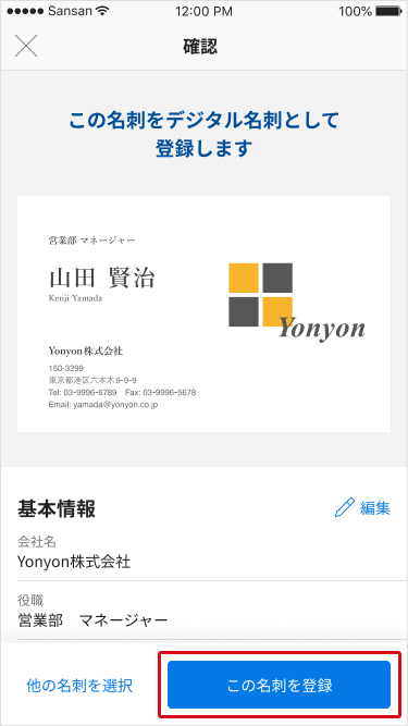 もしくは、[確認して登録] が表示される場合には、タップしてあなたのユーザー名またはメールアドレスに一致した名刺を選択し、[この名刺を登録]をタップし登録を完了させてください。