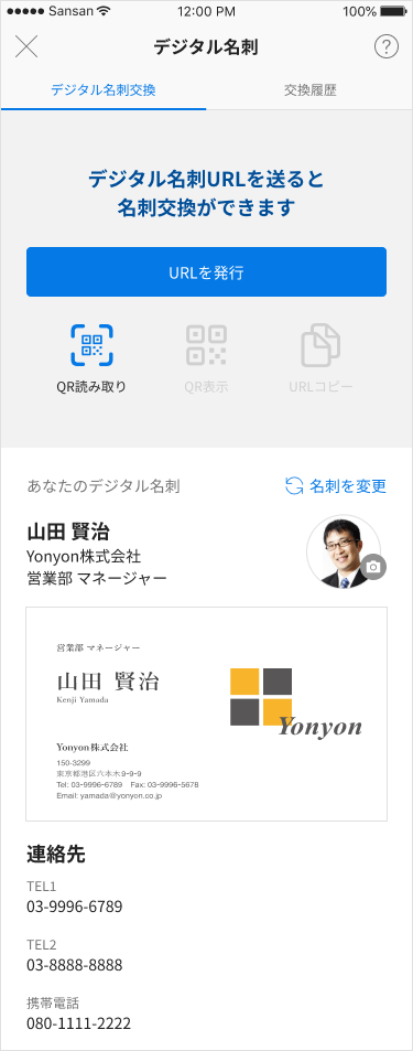 登録されたデジタル名刺を確認してください。顔写真を設定すれば、名刺と一緒に顔写真も送ることができます。