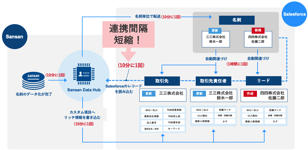 Salesforceに登録された取引先・取引先責任者・リードのレコードに対してSansan Data Hubが取り込むまでの間隔が10分に1回に短縮されました。