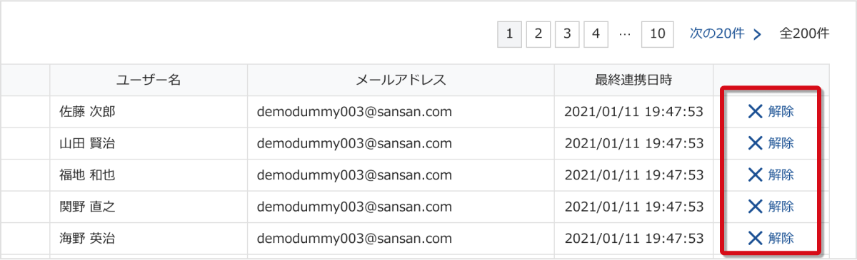 連携解除をしたいユーザーを指定し、[解除] を選択してください。
