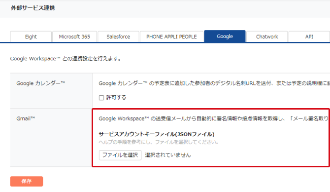 ※ サービスアカウントキーファイルは、[メール署名取り込み]と[スマート接点管理]で共用となります