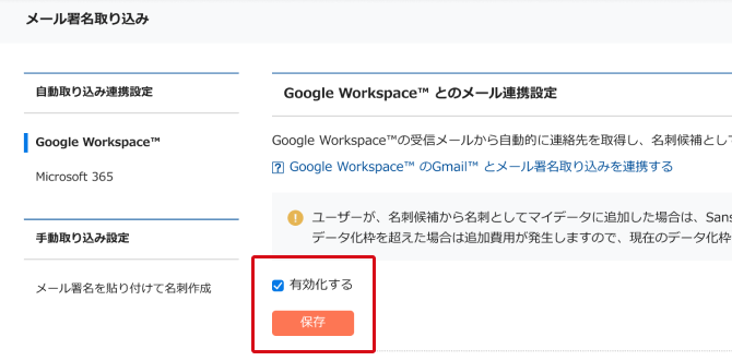 サービスアカウントキーファイルの登録後、[メール署名取り込み]( [管理者設定] > [メール署名取り込み])に戻り、有効化にチェックし保存します。機能の有効化をお知らせする管理者メールが届きます。