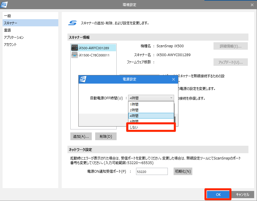 スキャナーの電源が自動で切れる場合、スキャナーの電源設定を変更してください。