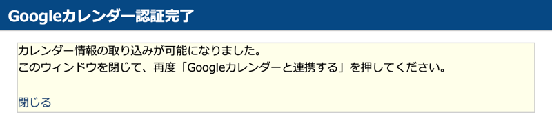c.Googleカレンダー認証完了画面が表示されたら、[閉じる]をクリックします。