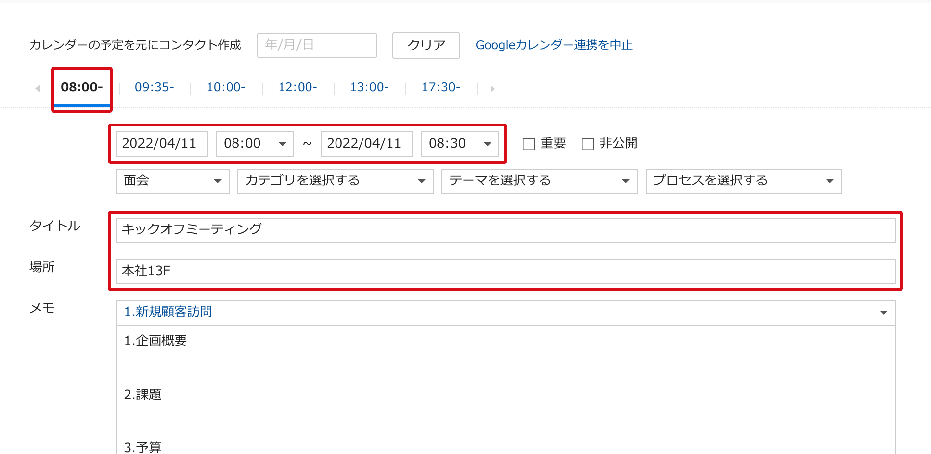 時間のタブをクリックすると、[開始日時-終了日時][タイトル][場所]が読み込まれます。