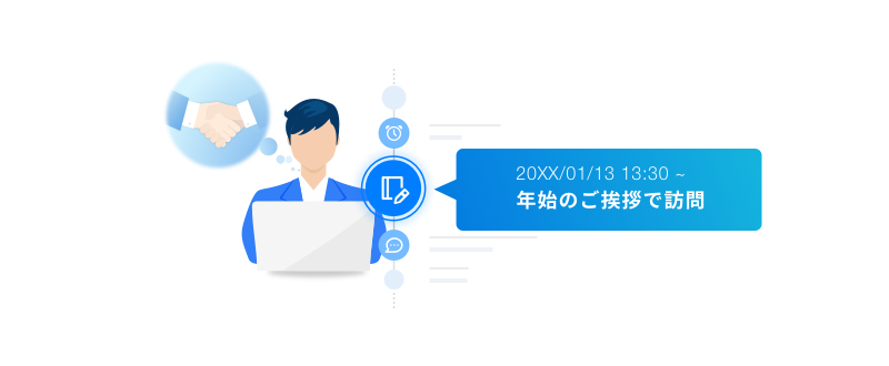 いつ、誰が、どこで、誰と、何を行ったのか(どんな会話をしたのか)を登録することができます。
