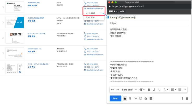 指定した名刺情報をメール本文に付加した状態でメーラーを起動する(