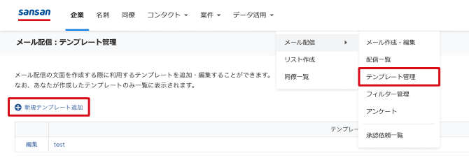 1.[メール配信]>[テンプレート管理]の画面を開き、「新規テンプレート追加」を押してください。