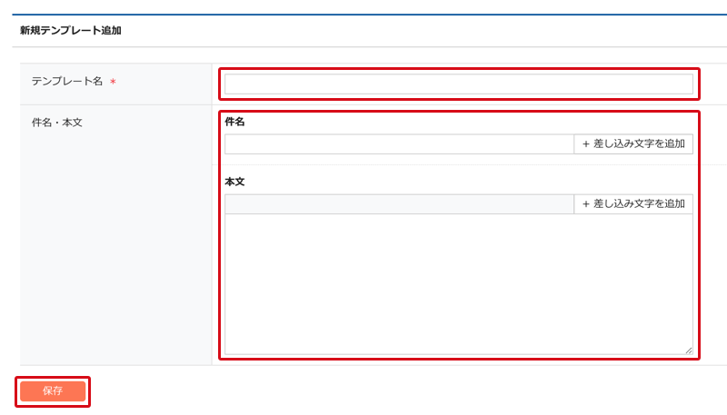 2.新規テンプレート追加画面より、テンプレート名・件名・本文を入力し、「保存」を押してください。