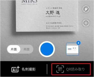 2. デジタル名刺画面に遷移した場合、名刺撮影画面に遷移した場合、共に[QR読み取り]をタップしてください。