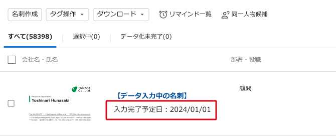 ここではスキャンした名刺の入力完了予定日を確認する方法をご案内します。