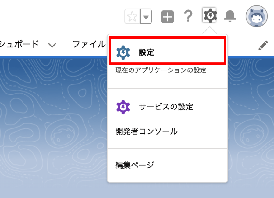 1. Salesforceへ管理者権限でログイン後、画面右上の[歯車型]アイコンをクリックして、「設定」をクリックします。