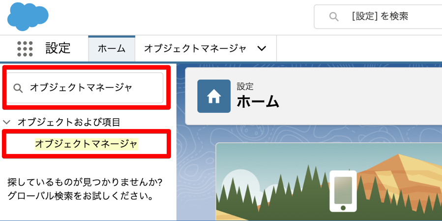 2. 設定画面へ遷移しますので、クイック検索で「オブジェクトマネージャ」と入力し、検索結果に表示された「オブジェクトマネージャ」のリンクをクリックします。