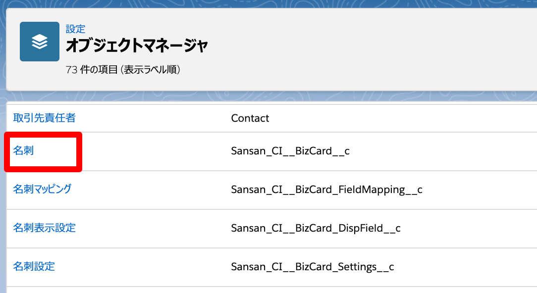 3. オブジェクトマネージャ画面内から、「名刺」(設定先のオブジェクト)を探し、リンクをクリックします。