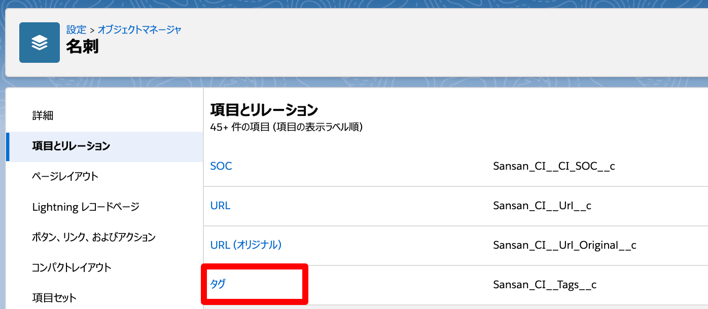 4. [項目とリレーション] から、「タグ(Sansan_CI__Tags__c)」をクリックします。