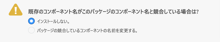 ※「既存のコンポーネント名がこのパッケージのコンポーネント名と競合している場合は?」というポップアップメッセージに対しては、「インストールしない。」を選択してください。