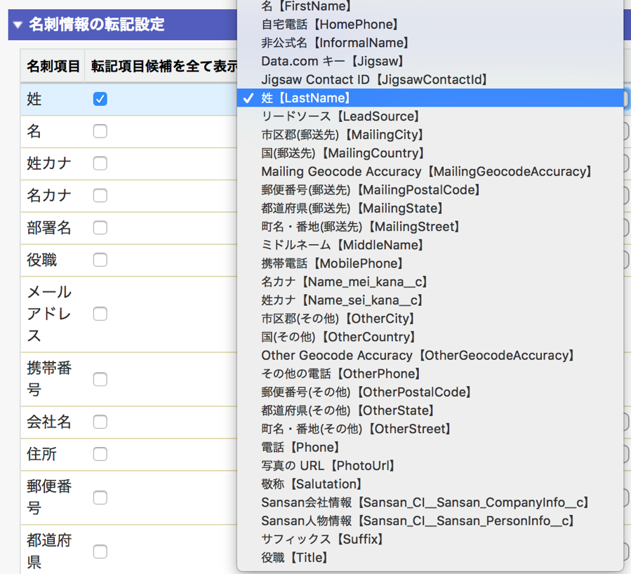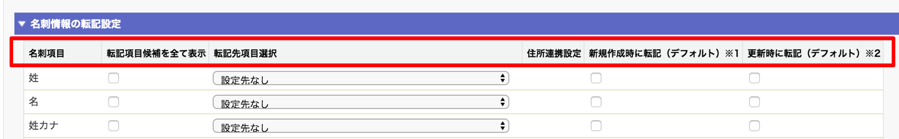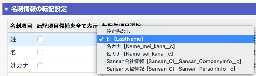 名刺データをどの項目へ転記させるかをプルダウンのなかから選択します。