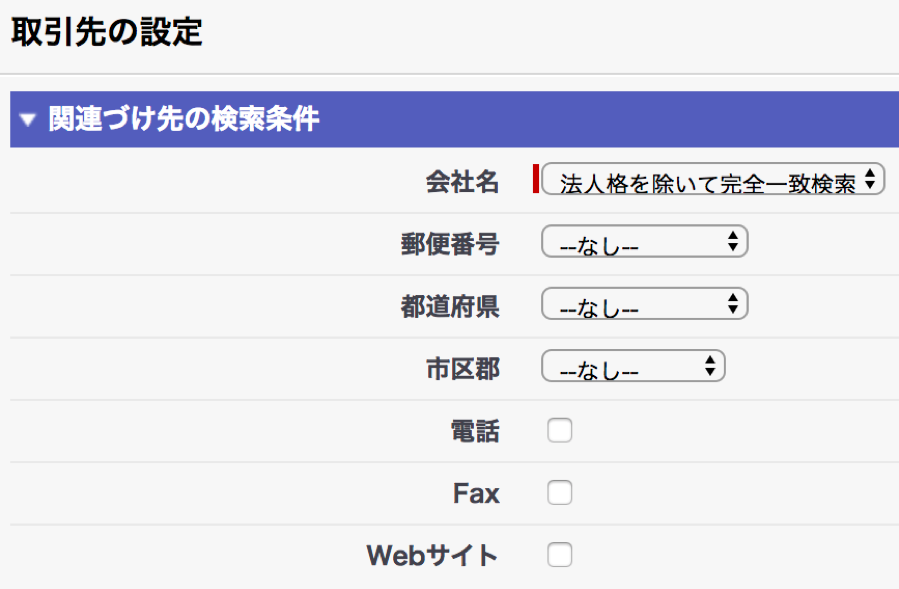 検索条件はお客様の運用状況に合わせて選択をしてください。なお任意選択となっている項目(電話番号やWebサイトなど)は、選択すると「AND条件」として解釈されますので、検索候補がより絞り込まれる設定となります。