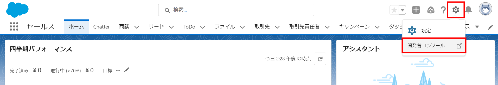 1. システム管理者権限をもつSalesforceアカウントでSalesforceへログイン後、右上にある歯車アイコンをクリックし、「開発者コンソール」をクリックします。