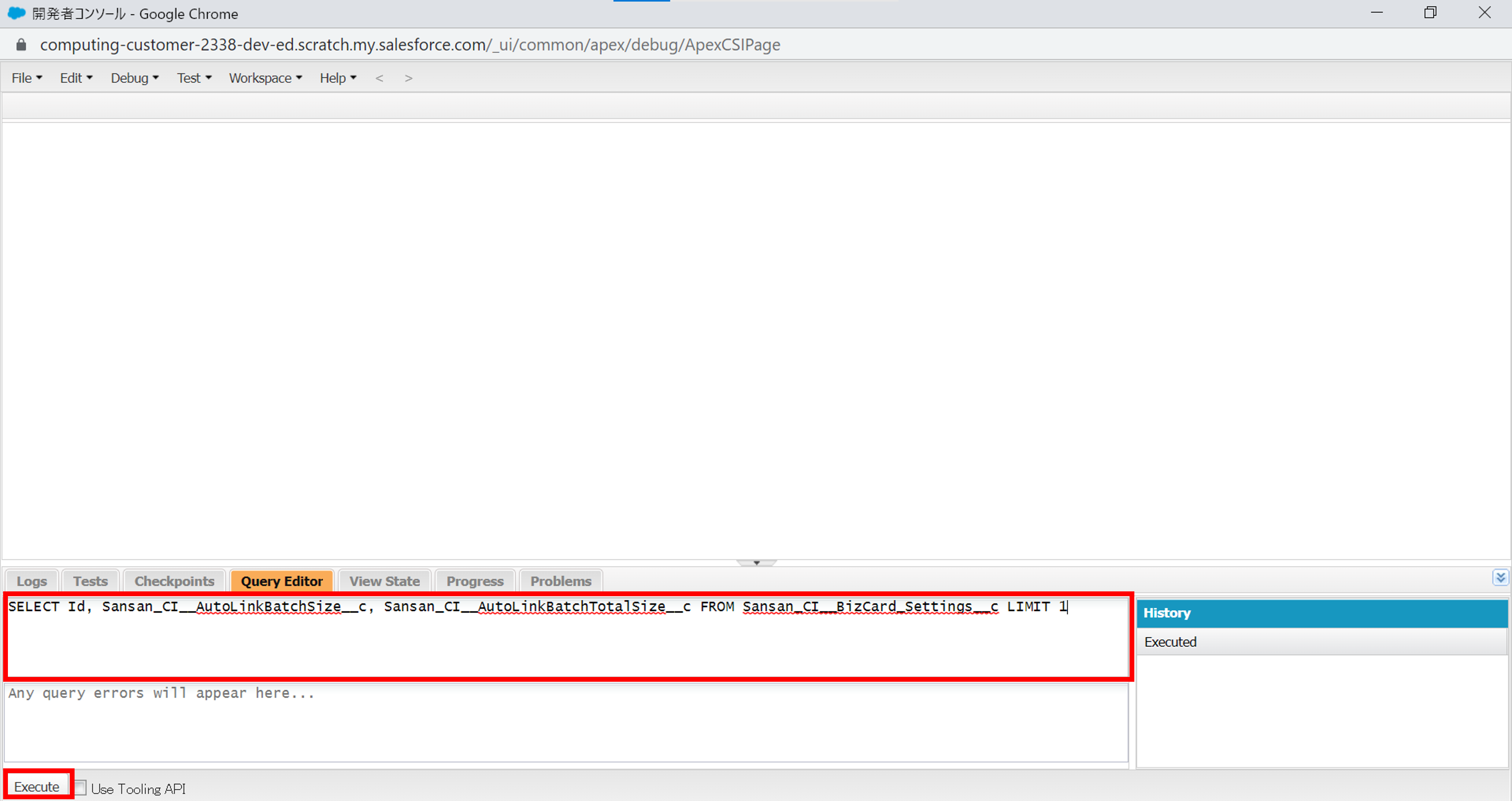 3.「Query Editor」タブの下にあるテキストボックスに下記のSOQL文をコピーして入力し、「Execute」ボタンをクリックします。