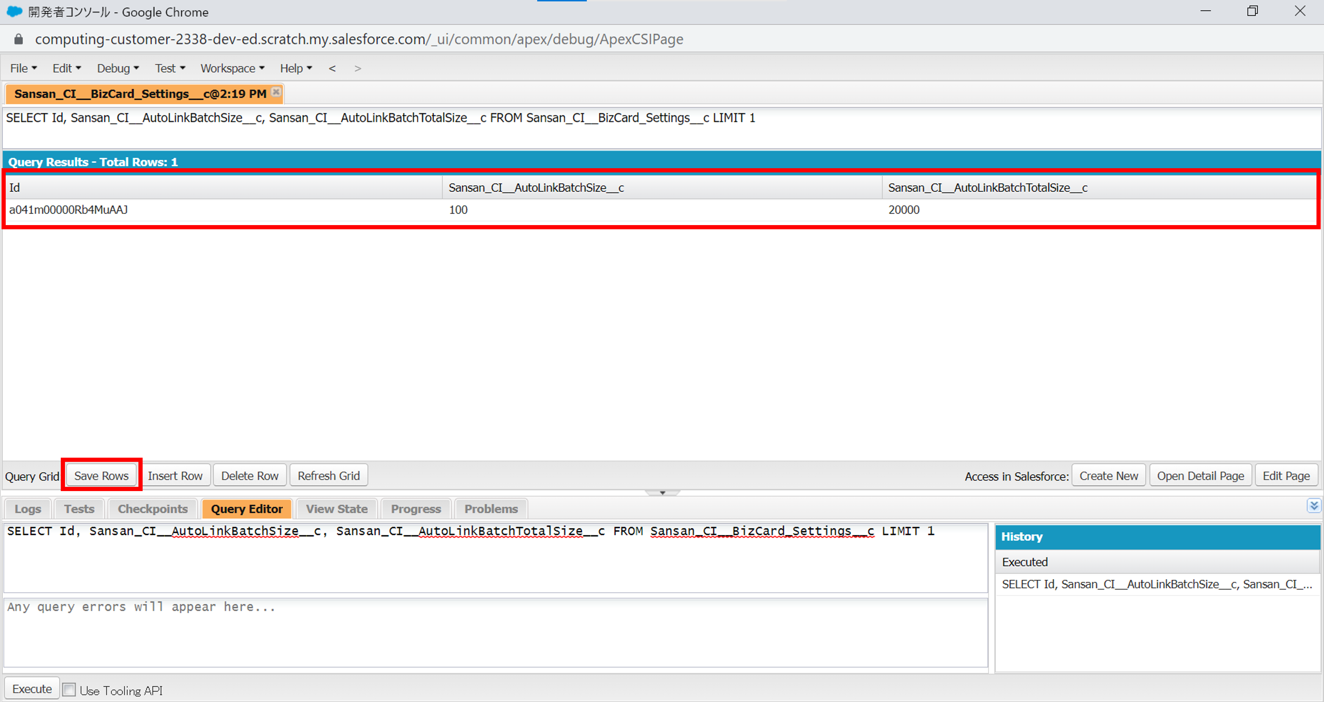 4. 画面中央に出てくる行の値をダブルクリックして、値を変更して「Save Rows」ボタンをクリックします。