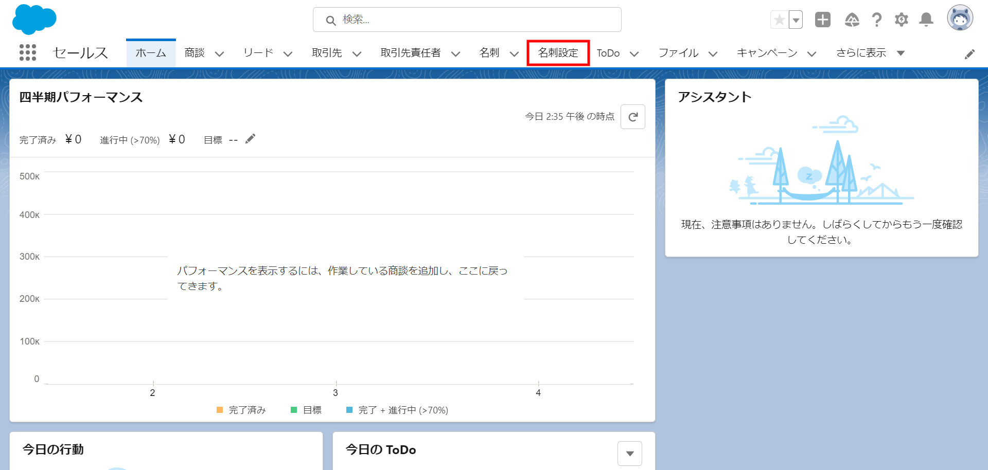 1. システム管理者権限をもつSalesforceアカウントでログイン後、[名刺設定]タブをクリックします。