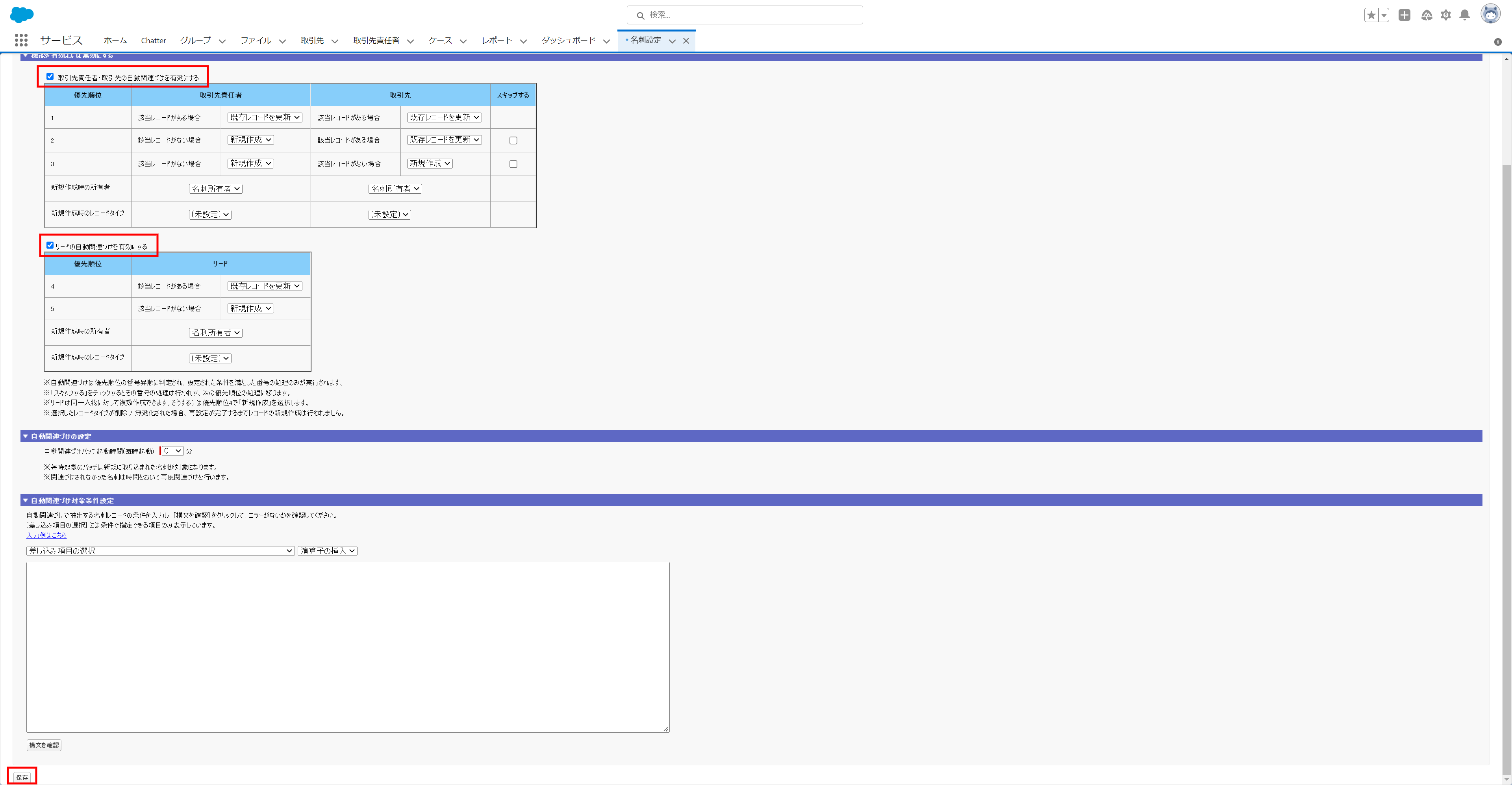 「取引先責任者・取引先の自動関連づけを有効にする」と「リードの自動関連づけを有効にする」にチェックを入れ、以下のように設定してください。