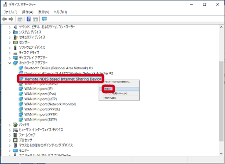 2. ネットワークアダプタを開き、「Remote NDIS based Internet Sharing Device」を右クリックで削除してください。