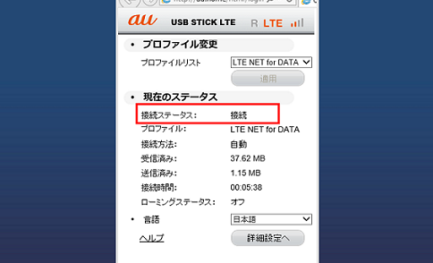 4. ポップアップ画面「USB STICK LTE」上の接続ステータスに「接続」と表示されます。