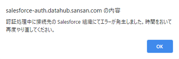 Salesforceとの認証時に『認証処理中に接続先のSalesforce組織にてエラーが発生しました。時間をおいて再度やり直してください。』というメッセージが表示された場合、Salesforce側で何らかのエラーが発生し、認証に失敗したことを意味しています。