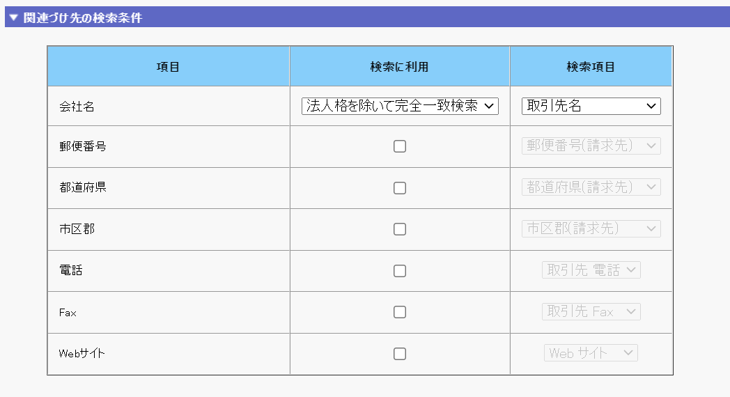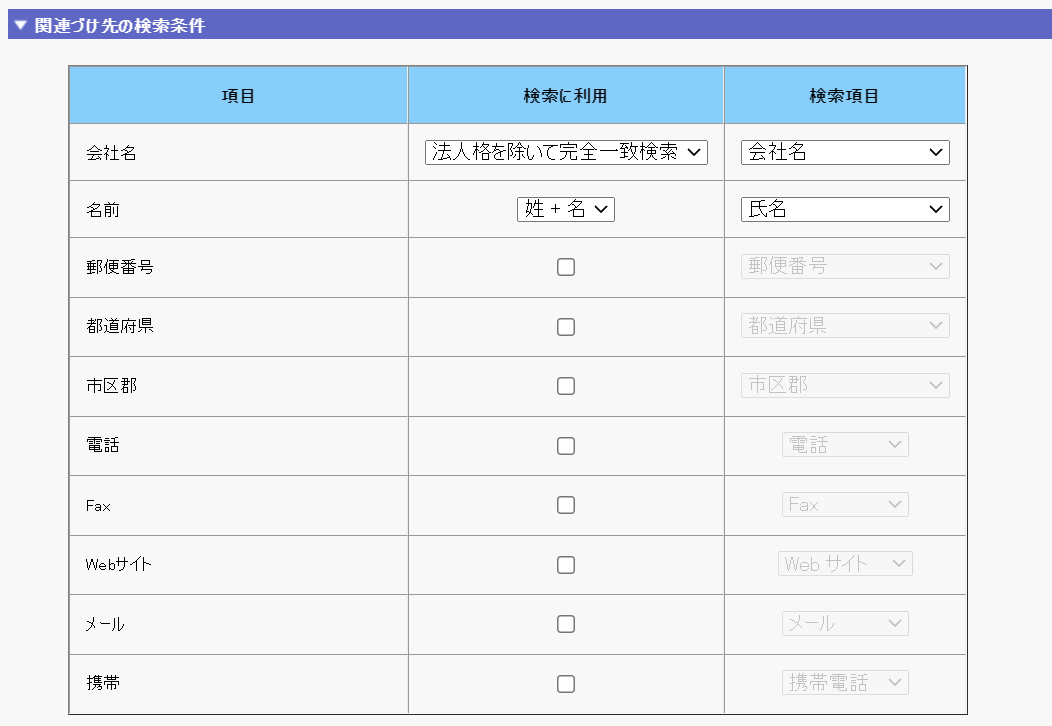 プルダウンから「取引先」を選択したら、下部の「関連づけ先の検索条件」では表のように設定してください。