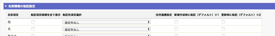 | 名刺項目 | 転記先項目選択 | 住所連携設定 | 新規作成時に転記 | 更新時に転記 |