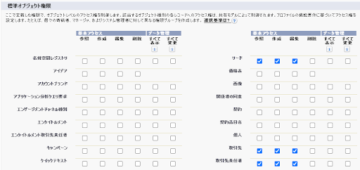 「標準オブジェクト権限」セクションにて権限を設定します。