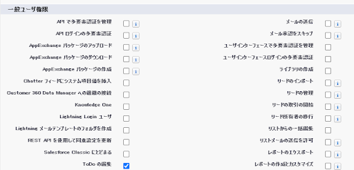 「一般ユーザ権限」セクションにて、必要な権限にチェックします。