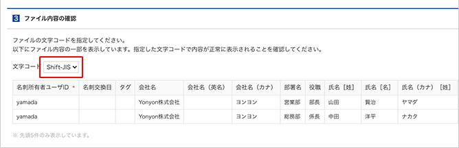ファイル選択後、以下のように文字化けして表示される場合は、CSVファイルの文字コードに原因があります。文字コードのプルダウンをクリックして、読み込み時の文字コードを[UTF-8]か[Shift-JIS]で指定することができます。